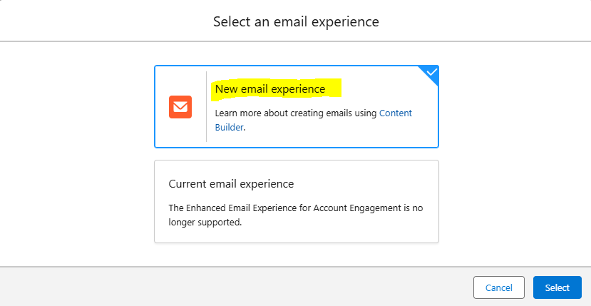 Select ‘New email experience’ to create or edit your emails in the Marketing Cloud Email Builder.